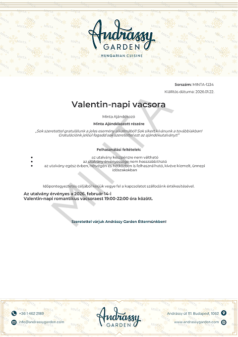 Lepje meg kedvesét egy romantikus 4 fogásos vacsoraélménnyel, ahol az ízek, a hangulat és a zene tökéletes harmóniában találkoznak az Andrássy Garden Étteremben február 14.-én!