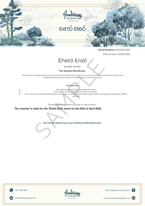 Az Ehető Erdő vacsoraest ára 39.437 Ft, amely az ÁFÁ-t és a 13%-os szervizdíjat tartalmazza. Az alkoholos italok nem szerepelnek a csomagban, fogyasztásuk az itallap árainak megfelelően külön fizetendő.